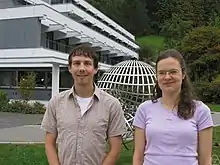 ![]() Karl Mahlburg and Kathrin Bringmann at Oberwolfach (2009) | |