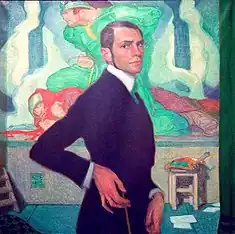 His correspondence with the industrialist, Ludwig von Heyl, makes it clear that he was no friend of National Socialism.[2] As the years progressed, his attitude toward the Nazi régime became more resistant, and he grew increasingly isolated, although he retained his professorship. He was not an admirer of contemporary art movements, but was very disturbed by the Degenerate Art exhibition of 1937. His last known work, in 1942, involved decorative paintings for the Officers' Home in Stuttgart. A newspaper article on the occasion of his sixty-fifth birthday in 1944 states that "the Reich Minister Dr. Goebbels telegraphed congratulations".[3] After the war, he retired to his property in Gut Osternberg, and died there in 1948. He never married, and had no children.