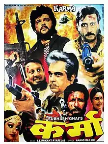 Karma (Hindi:कर्मा) is a 1986 Indian Hindi-language action thriller film directed by Subhash Ghai and featuring an ensemble cast including Dilip Kumar, Nutan, Jackie Shroff, Anil Kapoor, Naseeruddin Shah, Sridevi, Poonam Dhillon, Satyanarayana Kaikala and Anupam Kher. The film reunites Subhash Ghai and Dilip Kumar after the success of their last film together Vidhaata (1982). The film also marked the first time Dilip Kumar was paired with veteran actress Nutan. It was the top grossing Indian film of 1986 and the eleventh highest-grossing Bollywood film of the decade.[2][3]