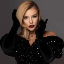 Peristeri's performance of "Karma" for the Eurovision Song Contest was directed by Swedish artistic director Sacha Jean-Baptiste.[57][58] The singer wore a short steel-sequined silver dress with tassels made of crystals,[59][60][61] designed by Kosovo-Albanian fashion designer Kujta and Meri.[62] Peristeri performed alone on stage as the main focus throughout the show, with the lights shining down on her several occasions.[63] Her performance began with the silhouette of herself against a red and black LED backdrop, with a red beam of light and clouds of smoke rising at the onset of the instrumentation.[64][65] It continued with Peristeri creating alternating circles of light through hand movements behind her until she pushed it away with her hand.[66][67] During a large portion of the performance, the LED emphasis was on red, with flashing lights alternating back and forth between red and turquoise.[63][67] As the song progressed towards the end, the backdrop turned grey and white to create a stormy effect, which was visually amplified by smoke effects on stage around the singer.[63][64]