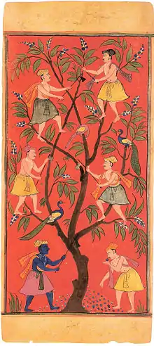 The Jain texts further illustrate the effects of leśyās on the mental dispositions of a soul, using an example of the reactions of six travellers on seeing a fruit-bearing tree. They see a tree laden with fruit and begin to think of getting those fruits: one of them suggests uprooting the entire tree and eating the fruit; the second one suggests cutting the trunk of the tree; the third one suggests simply cutting the branches; the fourth one suggests cutting the twigs and sparing the branches and the tree; the fifth one suggests plucking only the fruits; the sixth one suggests picking up only the fruits that have fallen down.[37] The thoughts, words and bodily activities of each of these six travellers are different based on their mental dispositions and are respectively illustrative of the six leśyās. At one extreme, the person with the black leśyā, having evil disposition, thinks of uprooting the whole tree even though he wants to eat only one fruit. At the other extreme, the person with the white leśyā, having a pure disposition, thinks of picking up the fallen fruit, in order to spare the tree.[37]