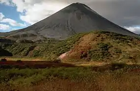Karymsky is a symmetrical stratovolcano rising within a 5-km-wide caldera that formed during the early Holocene. Much of the cone is mantled by lava flows less than 200 years old. Historical eruptions have been vulcanian or vulcanian-strombolian with moderate explosive activity and occasional lava flows from the summit crater.[2] There is currently an ongoing cycle of non-stop eruption occurring, and is the peninsula's most active, and reliable volcano, which has been erupting continuously since 1996.