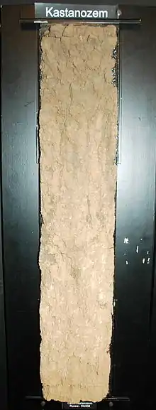 Kastanozem (also known as "chestnut soil") is one of the 32 Reference Soil Groups of the World Reference Base for Soil Resources (WRB). These soils are brighter than Chernozems, and are related to the Mollisols in the USDA soil taxonomy. They are rich in humus, and originally covered with early maturing native grasslands vegetation, which produces a characteristic brown surface layer in the first meter in depth. They have a relative high level of available calcium ions bound to soil particles and can have a petrocalcic horizon between 25 and 100 cm thick.