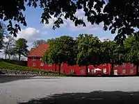 The Commander's House (Danish: Kommandantboligen) served as the residence of the commander of Kastellet. It was built in 1725 in the Baroque style by architect and master builder Elias Häuser who also designed the first Christiansborg Palace which burned in 1794. Built in yellow-dressed masonry with white detailing, it consists of two floors under a red tile roof. The triangular pediment is decorated with a relief and Christian VII's monogram under topped by a crown. It served as the official residence of the Chief of Defence until 2008.[3]