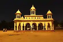 The ground generally known as KP was part of the land ceded to East India Company by the treaty of 1818. It was under the control of British army (Madras Army) for many years. It had build few building on this ground as arsenal and had stored several tons of explosive gun powder till late 19th century. In 1880 Nagpur Civil Station municipal committee was formed and the land was handed over to the civil authorities. Kasturchand Daga donated rupees twenty five thousand for construction of an open pavilion during the exhibition in the year 1905.the Pavilion in the center of the Arsenal Ground. This was built with pale sandstone found locally and is a permanent structure destined to be a perpetual memory of the Exhibition of 1908 in days to come. The structure is light and graceful in design,characteristically Indian in its intricate arches and elaborate pillars rising one above the other to the delicate cupolas that crown the whole. It was designed and carried out by W.B Starkey, the Superintending Engineer, the finest carving being done by local skill. A marble plaque over the central arch on the southern side of the Pavilion says that the Pavilion was constructed to commemorate the Industrial Exhibition of 1908 by Diwan Bahadur Kasturchand Daga. The plaque now lies unnoticed under a layer of whitewash.[7]