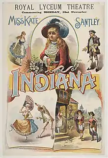 In 1878, Santley produced and starred in Dipunacy, which was a popular burlesque of Diplomacy. 1879, at the Royalty Theatre, Santley played in La Marjolaine and starred in (and produced) Little Cinderella and in the hit Tita in Thibet by Frank Desprez.[5] In 1880, she played in the Drury Lane pantomime Mother Goose (and the Enchanted Beauty) with Arthur Roberts, the popular music hall comedian. In 1883, Santley starred in the English adaptation of Edmond Audran's Gillette de Narbonne.[6] The following year, she played in La Cosaque at the Royalty, and in 1886, she hired Sidney Jones as musical director for the tour of her musical Vetah. In 1887, she played the title role in Indiana at the Grand Theatre, Islington, and then on tour.[7]