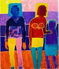 Critics such as Lilly Wei identify Bradford's "Friends and Strangers" (2018), "Legs and Stripes" (2019) and "Mother Paintings" (2021) exhibitions as departures in terms of palette, process and collective themes, such as race, sexuality, gender and identity.[3][38][69][70] The former shows were characterized by vibrant pinks, magentas, purples and yellows, directly drawn thick outline, monumental scale, and the use of gesture and facial direction rather than expression to convey emotion.[3][38][69][71] In paintings such as Olympiad (2018), she experimented with colors mixed with fluorescent magenta paint and improbable arrangements of figures that balanced interests in how subjects fit together as abstract compositional elements and as potential social communities.[46][14][72] Works such as Choice of Heads (2019) and Couple No Shirts (2018) explored identity; in the latter, an androgynous, economically drawn couple serves to both imply universality and examine assumptions involving categorization and looking.[14][69][11]