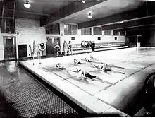Kay Curtis introduced synchronized swimming in 1934 at the Chicago World's Fair with Norman Ross as her announcer.[2] To her, synchronized swimming was a co-ed sport as it still might be if she hadn't been transferred overseas (1943-1962) with the Red Cross as recreational director. One of her early disciples was Hal Henning. She staged a production for the Armed Forces in the spectacular fountains and pools and gardens of the palace built by the Kings of the Two Sicilys and used as Allied headquarters in Caserta, Italy. When she finally returned home in 1962 after observing synchronized swimming all over Europe, her baby was a full-blown sport and has been a dominant American aquatic sport and art form ever since. Her pioneer book Rhythmic Swimming (1936) was a classic textbook on the sport she originated.[3] Her no-nonsense ability to say it like it is made her not only the tough mother of synchronized swimming but led Bill Bachrach to call Kay Curtis "the only person I was ever jealous of in swimming".[4]