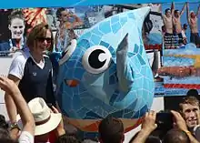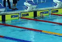 At the 2012 Summer Olympics in London, Ledecky qualified to swim in the final of the 800-meter freestyle by placing third overall in the heats with a time of 8:23.84.[29] In the final, Ledecky stunned the field, winning gold by more than four seconds, with a time of 8:14.63, the then second-fastest effort of all time just behind Rebecca Adlington's world record of 8:14.10 set in 2008.[30] In addition, she broke Janet Evans' American record of 8:16.22 that had stood since 1989. In the final, Ledecky went out hard and, by the 200-meter mark, she had already established an almost body-length lead. Her 400-meter split was 4:04.34, a personal best for Ledecky in that distance, and would have placed fifth in the individual 400-meter freestyle. At the 750-meter mark, Ledecky was 3.42 seconds ahead of Mireia Belmonte García, and 0.31 seconds under world record pace. Ledecky won by 4.13 seconds and just missed the world record by 0.53 seconds. Her gold was the first international medal of her career, earning her the 2012 Best Female Performance of the Year and Breakout Performer of the Year at the Golden Goggle Awards.