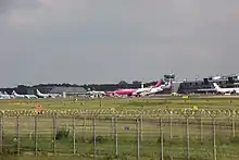 The airport's concrete runway is 3200m by 45m, oriented 8 and 26, and can accommodate aircraft as large as Boeing 747 or Boeing 777, albeit not at MTOW.[17] Heavy transports such as Antonov An-124[18] or An-225[19][20] have been noted to land there on occasions. The airport uses new generation Instrument Landing System, a Thales 420 system.[21] The runway at Katowice Airport is the second longest runway in Poland, behind Warsaw Chopin's runway 15/33. 33 new aircraft stands are under construction as of now. They will be located between taxiways E (Echo) and H (Hotel), to the west from main apron, between main and cargo apron and to the east from cargo apron.