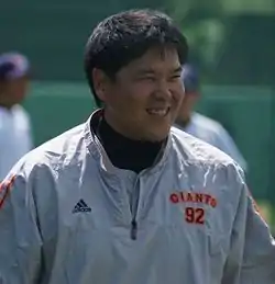 Nomura's contract was purchased by the Yomiuri Giants before the start of the 2004 season. While it was a relatively minor trade, it made headlines because of his father's longtime resentment toward the Giants. Some also saw the trade as an opportunity for him "to step out of his famous father's shadow."[2] However, Nomura only played in three games with the Giants and was released following the end of the 2004 season. He played his final two seasons with the Tohoku Rakuten Golden Eagles in 2005 and 2006, the latter of which was managed once again by his father. He announced his retirement on September 30, 2006.[3] Throughout his playing career, Nomura was utilized as a second or third-string catcher.[2] After playing, Nomura transitioned to coaching in the league. He has coached for three different teams since 2007 and is currently with Rakuten.[4]