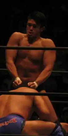 Shibata made his professional wrestling debut on October 10, 1999, facing close friend Wataru Inoue at a New Japan Pro-Wrestling (NJPW) event. Alongside fellow rookies Hiroshi Tanahashi and Shinsuke Nakamura, Shibata became known as one of the "new Three Musketeers".[5] In 2000, Shibata took part in the 2000 Young Lion Cup, eventually finishing 3rd place with 6 points.[6] During the tournament he was involved in a serious incident when he hit Masakazu Fukuda with an elbow drop during a match. Fukuda was in a coma and died 4 days later in hospital.[7] Shibata and Wataru worked their way up the junior ranks together, though Shibata was a slight step ahead of Inoue throughout their joint rise, and subsequently challenged for the IWGP Junior Heavyweight Championship first against Kendo Kashin on October 28, 2001,[8] but lost. Shibata and Inoue also challenged for the IWGP Junior Heavyweight Tag Team Championship on two occasions both against Jado & Gedo, but lost both times.[9] By 2003, Shibata graduated to the heavyweight division and joined the Makai Club wrestling as himself and as Makai #4.[10] From there, he continued to rise in the ranks. In July 2003, Shibata challenged for both the IWGP Tag Team Championship and the IWGP U-30 Openweight Championship but failed to win either title.[11] Shibata then entered the 2003 G1 Climax, where he placed 3rd in his block with 5 points.[12] Shibata continued to grow in 2004. On July 19, 2004, he received his first shot at the IWGP Heavyweight Championship against Kazuyuki Fujita but lost by knockout.[13] One month later, he entered the 2004 G1 Climax and won his block scoring eight points and defeated several former IWGP Champions including Masahiro Chono, Shinsuke Nakamura, and Genichiro Tenryu but would lose in the semi-finals to eventual winner: Hiroyoshi Tenzan.[14] Following the G1, Shibata joined Masahiro Chono's new stable: Black New Japan, where he remained until eventually leaving New Japan in January 2005.