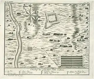 The fort was located on the slope of a hill, with 5 m (16 ft) high ramparts, a single gateway and a 4 m (13 ft) walkway on top. It was diagonal in shape, with two bastions, which each accommodated six cannon,[3] as a result it was often described as a redoubt rather than a fort.