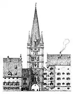 The Kaufingertor was one of the five city gates built around at the end of the 12th century, as the first city walls of medieval Munich.[1] It was located in the west of the old town, approximately at the point where today's Färbergraben and Augustinerstraße meet on Kaufingerstraße.[2]