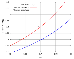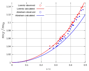 Kaufmann noticed that the observed increase cannot be explained by this formula, so he separated the measured total mass into a mechanical (true) mass and an electromagnetic (apparent) mass, the mechanical mass being considerably greater than the electromagnetic one. However, he made two mistakes: As shown by Max Abraham, Kaufmann overlooked that Searle's formula only applies in the longitudinal direction, but for deflection measurements the formula for the transverse direction was important. Therefore, Abraham introduced the "transverse electromagnetic mass" with the following velocity dependence: