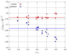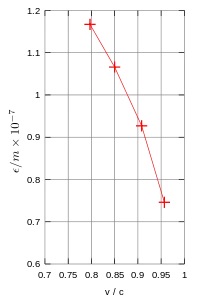 Kaufmann published a first analysis of his data in 1901 – he actually was able to measure a decrease of the charge-to-mass ratio, thus demonstrating that mass or momentum increases with velocity.[6] Using Searle's formula (1897) for the electromagnetic energy increase of charged bodies with velocity, he calculated the increase of the electron's electromagnetic mass as a function of velocity: