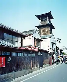 - Kurazukuri Street (蔵造りの町並み, Kurazukuri no machinami) is lined with traditional warehouses constructed in a style called kurazukuri (蔵造り) and maintains the style of the Edo period. The city of Kawagoe started building kurazukuri-style warehouses in the aftermath of a great fire that consumed one-third of the old Kawagoe in 1893. The style was designed to be fireproof. Within and beyond the Kurazukuri Street, many warehouses from the 18th and 19th centuries can still be seen. The Kawagoe Kurazukuri Museum is located in a traditional warehouse built in 1893 and allows its visitors to walk around inside and experience the life of Edo merchants.[9][10] The artisan shops in the area include Machikan, a sword and knife manufacturer in operation for generations.[11]