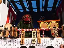 Ohayashi is the musical accompaniment played by five musicians namely 1 flute, 1 large drum, 2 small drums and 1 handbell. Together with dancers with a mask of a fox or a lion, they play a great performance and dancing on the stage of the float.[3]