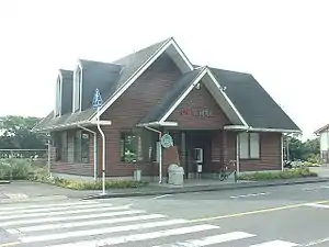 The station consists of an island platform serving two tracks at grade with a siding. The station building is a modern timber structure built in western style to resemble a mountain cabin. It houses a staffed ticket window and a waiting area. Access to the island platform is by means of a level crossing with ramps at both ends. The station is not staffed by JR Kyushu but some types of tickets are available from a kan'i itaku agent on site who staffs the ticket window.[2][3][4]