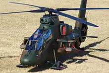During the 1990s, the JGSDF was interested in procuring a new attack helicopter during the following decade, seeking to replace the Fuji-built Bell AH-1 Cobra fleet. Amongst the proposals produced by Japanese industries was a derivative of the OH-1, tentatively designated as the AH-2.[10][11] In 1999, it was revealed that the JGSDF was actively studying the modification of the OH-1 into an attack helicopter suitable to their requirements.[12][13] The OH-1 had been intentionally designed with additional margin to accommodate such growth of scope, the main limiting factors being its transmission and engines. The AH-2 proposal would have involved installing uprated engines and the addition of new unspecified armaments for anti-tank combat missions; Boeing in particular was dismissive of the value of the proposed rotorcraft, claiming that it "cannot fulfill the attack requirement".[14] Kawasaki's proposal was ultimately rejected in favour of a locally-built variant of the Boeing AH-64 Apache.[1]