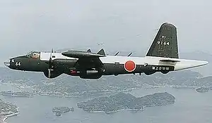 The Kawasaki-built P-2J (originally P2V-Kai, where "Kai" (改) means modification) was the last version of the Neptune to be produced. Work on the P-2J was begun in 1961.[1] The first P-2J, converted from a P2V-7 (P-2H) performed its initial flight on 21 July 1966, and the last of a further 82 production P-2Js was delivered in March 1979.[2]