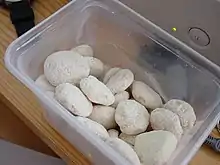 The traditional drinks are fermented mare's milk (qymyz),[8] camel's milk (shubat),[9] cow's milk (Ayran), and sheep's milk, as well as their products qaymaq (sour cream), qatyq or ayran (buttermilk), qurt (which is made from dried cheese and whey rolled into balls),[7] and irimshik (dried sour milk product similar to qurt, but not rolled into balls).[10] These drinks were traditionally consumed with the main course. However, meals often end with qymyz and then tea.[7] In the summer, shubat is one of the staple drinks of the Adai Kazakhs.[11] Black tea was introduced from China after the foundation of the Silk Way and was traditionally consumed with sweets after the main course. Nowadays it has virtually replaced other traditional drinks and every meal is accompanied with tea. The tea ceremony, taking its roots from the nomads many centuries ago, is a special dastarqan (дастарқан) ritual in Kazakhstan. Kazakh tea is typically strong black tea with milk or cream.