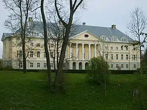 The palace was built in the years 1800–1804 in the style of late classicism, built by the project of Johann Gottfried Adam Berlitz.[2] There is stone bridge, leading to the palace. On the other side of the river there are remnants of the manor buildings; house of the servants, stables, house of the steward and barns. The palace was burned down by local peasants during the Revolution of 1905.[3] However, German baron von Manteuffel renovated it by the project of Paul Schultze-Naumburg in 1907.[4] The renovation of the Kazdanga palace became an important event for the development of the Neo-Classicism style. It was designed by the well known German architect and Neo-Classicism Paul Schultze-Naumburg.[5] In contrast to scenic, borrowed forms, the architect declared a return to the Homeland tradition and accuracy.