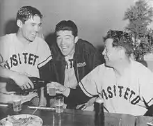 ![]() Inao (center) with teammate Yasumitsu Toyoda(left) and manager Osamu Mihara during the 1956 Japan Series | |