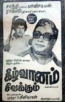 Keezh Vaanam Sivakkum (transl. The lower sky will be red) is a 1981 Indian Tamil-language film, directed by Muktha Srinivasan and produced by S. Ravi. The film stars Sivaji Ganesan, Saritha, Jaishankar, Sarath Babu and Menaka. It is based on the play of the same name by Kuriakose Ranga. The film was released on 26 January 1981 and become a box-office hit, running for over 100 days in theaters. It was remade in Telugu as Gopala Krishnudu and in Malayalam as Chakravalam Chuvannappol.