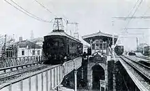 The line opened on 20 December 1914 as an electrified passenger line connecting Shinagawa Station in Tokyo with Takashimacho Station in Yokohama.[8] (The latter station was renamed Yokohama Station in August 1915, when the former Yokohama Station was renamed Sakuragicho Station).[8] It was originally called the Tokaido Electric Line(Japanese: 東海道電車線) and was subsequently renamed to the Keihin Line(Japanese: 京浜線).[8] From 30 December 1915, services were extended south to the new Sakuragicho Station.[8]