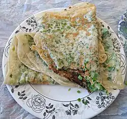 Kelaneh (Kurdish: کەلانە, romanized: Kelane) is known primarily for being a type of bread, but the term encompasses a full meal that is particular to Kurdistan. In spring, the bread is filled with wheat flour and a kind of honeysuckle called ivy, while in other seasons onions are the filling.[1][2][3] Traditionally this flatbread is filled with scallion (or chives or wild garlic) and made them a smaller size to fit in a frying pan on a home stove compared to the convex metal griddle over an open fire (saj)[4]