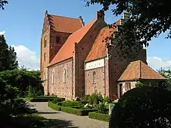 The imposing red brick church is one of the three Møn churches decorated with frescos by the Elmelunde Master, probably towards the end of the 15th century. In the Biblia pauperum style, they present many of the most popular stories from the Old and New Testaments. There are also a number of earlier frescoes in the church dating back to about 1275.[1]