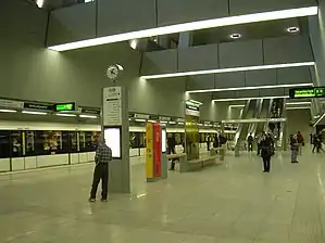 Keleti pályaudvar (Keleti Railway Station) is a transfer station on M2 and M4 lines of the Budapest Metro. The Line M2 station was open on 2 April 1970 as part of the inaugural section of Line M2, between Deák Ferenc tér and Örs vezér tere. The Line M4 station was opened on 28 March 2014 as the eastern terminus of the inaugural section of the line, from Keleti pályaudvar to Kelenföld vasútállomás.[1]