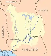 Kemijoki (Swedish: Kemi älv, Northern Sami: Giemajohka), with its 550 km (340 mi) length, is the longest river in Finland. It runs through Kemijärvi and Rovaniemi before reaching the Gulf of Bothnia at Kemi.[1]