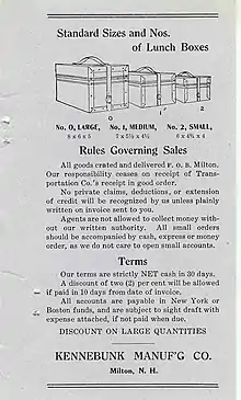 The Kennebunk Manufacturing Company (KEMACO) was incorporated in Maine on July 23, 1893 with John R. Littlefield of Boston, Mass., President and J. B. Lara of Kennebunk, Me., Treasurer. The purpose of the Company was the “manufacturing and dealing in cases, boxes, valises, grips, and trunks.”[1] The name, “Kennebunk Manufacturing Company” was the same name as that of an ill fated company that had tried to build a cotton mill at Kennebunk in 1825 and failed by 1828.[2] [3] The new Kennebunk Manufacturing Company merged with another Kennebunk manufacturer of similar travel items known as the Travelet Company after 1895.[4] The merged companies were purchased by J. Spaulding & Sons Company in 1902 and its operations were moved to Milton, New Hampshire where they occupied the old N.B. Thayer & Co, shoe factory until 1936. [5] [6] While in Milton the Kennebunk Manufacturing Company, manufactured megaphones, radio speaker horns and violin cases in addition to its original line of lunch boxes and suit and sample cases.