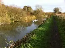 Between Kintbury Lock and Newbury, passing to the north of Hamstead Marshall, the canal is very close to the River Kennet, which flows into the canal via several channels.[115] The canal passes through an area known as the Kennet Valley Alderwoods, the largest remaining fragments of damp, ash-alder woodland in the River Kennet floodplain. The SSSI includes two woods – the Wilderness and part of Ryott's Plantation – which are important because they support a very great diversity of plants associated with this woodland type, dominated by alder (Alnus glutinosa); though ash is abundant in places and there is occasional oak and wych elm. In addition to the wide range of higher plants the woods support a diverse bryophyte flora including the uncommon epiphytes Radula complanata, Zygodon viridissimus and Orthotrichum affine.[116] Nearby is Irish Hill Copse. This site of coppiced ancient woodland includes an extensive area of calcareous ash/wych elm coppice on the hill sides, merging into wet ash/maple and acid oak/ash/hazel woodland with aspen, on the higher parts of the site. The lower slopes are dominated by dog's mercury, with abundant herb paris, toothwort, Solomon's seal, common twayblade and early-purple orchids and, locally, wild daffodil.[117]