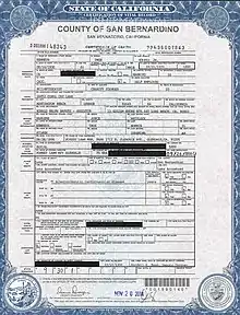 - Dennis Draeger, County Recorder (September 25, 1996), Certification of vital record, County of San Bernardino, California