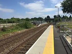 Building work to improve the station continued until the spring of 2016. For the platforms this meant a rebuild of platform 1, resurfacing of both platforms, the addition of sheltered and unsheltered seating, and the installation of LED lamp posts. The carpark was also improved, with the addition of dedicated motorbike and bicycle parking, and an illuminated noticeboard to display train timetables and planned service alterations.