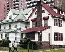 Throughout much of the 20th century, Kensington was seldom distinguished as a distinct neighborhood, with many residents and demographers identifying the area as the western section of Flatbush.[9][10][11][12][13][14] The descriptor West Flatbush was also used by various religious & civic organizations and urban planners in the first half of the 20th century before largely falling into disuse in the postwar era.[15][16] While the Kensington moniker continued to be employed by branches of certain governmental institutions (including the Post Office Department and the Brooklyn Public Library), it was also used by demographers to differentiate the largely working class, ethnically heterogeneous[17] tracts west of Ocean Parkway (then an upper middle class, predominantly Jewish American enclave roughly situated between the well-heeled residential thoroughfares of the Upper West Side and the more steadfastly middle class Grand Concourse in socioeconomic standing among New York City's Jewish American community at its late 1940s social apogee) from the historically affluent, Old Stock and Jewish American-dominated tracts east of Coney Island Avenue.[18] In his 2015 memoir, musician Marky Ramone (who resided at 640 Ditmas Avenue throughout much of his childhood in the 1960s) noted the area's distance from major thoroughfares in eastern Flatbush, necessitating a two-fare zone via bus to Erasmus Hall High School.[19]