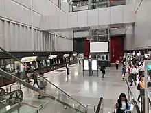 Under the Art in Transit programme, a multimedia work entitled Poetry Mix-Up was commissioned for the station. Created by Mixed Reality Lab from the National University of Singapore, this interactive piece allows members of the public to SMS a line of up to 60 characters to the program, and it will generate a short poem based on the submission to be shown on a digital display on the lift shaft at the platform level. These TV screens are however deactivated, and is only usable during the 2014 FIFA World Cup, 2014 Commonwealth Games and 2012 Summer Olympics.