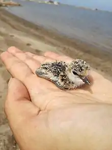 Kentish plovers are territorial shorebirds; the male usually has a territory and attracts females with courtship displays. The parents are actively defending their nest territories from predators by chasing, fighting or posturing them. When approached by predators in close proximity to the nest, the Kentish plovers quickly run away from the nest and start doing distraction displays to focus the predator's attention on themselves and lure them away from the nest. These displays include calling or crawling on the ground flapping their wings. Males tend to be more aggressive than females, but females performing riskier defensive behaviors than males.[29] When a plover's territory has been invaded, it invades a neighboring family's territory. This is when fights between males frequently occur because the plovers see their broods threatened. During such fights, it occurs that chicks get injured or even killed.[30] When approached by a predator, chicks usually try to find a spot where they can hide, crouch down and stay motionless to remain unseen. When they are older, they try to run away with their parents.