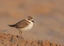 The Kentish plover (Charadrius alexandrinus) is a small cosmopolitan shorebird (40-44 g) of the family Charadriidae that breeds on the shores of saline lakes, lagoons, and coasts, populating sand dunes, marshes, semi-arid desert, and tundra.[2][3] Both male and female birds have pale plumages with a white underside, grey/brown back, dark legs and a dark bill; however, additionally the male birds also exhibit very dark incomplete breast bands, and dark markings either side of their head, therefore the Kentish plover is regarded as sexually dimorphic[4]