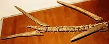 Typically for a stegosaur, Kentrosaurus had extensive osteoderm (bony structures in the skin) covering, including small plates (probably located on the neck and anterior trunk), and spikes of various shapes. The spikes of Kentrosaurus are very elongated, with one specimen having a bone core length of 731 millimetres.[20] The plates have a thickened section in the middle, as if they were modified spines.[33] The spikes and plates were likely covered by horn. Aside from a few exceptions they were not found in close association with other skeletal remains. Thus, the exact position of most osteoderms is uncertain. A pair of closely spaced spikes was found articulated with a tail tip, and a number of spikes were found apparently regularly spaced in pairs along the path of an articulated tail.[13]