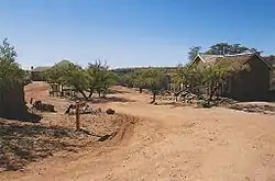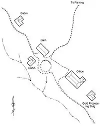 Today there are five adobe buildings at the town site. They were constructed circa 1904 and the largest building was probably the headquarters for the Santa Rita Water and Mining Company. Later, that same large building became the main ranch house as the land was used for cattle ranching. The small building behind the headquarters building was used to process gold samples, evidenced by liners that came from an assay furnace. Opposite a small house where Stetson may have lived are the remains of a ruined barn and another small adobe house remains at the far end of the site.[4]