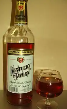 Kentucky Tavern is a brand of straight bourbon whiskey produced by the Sazerac Company at the Barton Distillery located in Bardstown, Kentucky, who acquired the brand from United Distillers in 1995.[1] The brand was originally produced and owned by the R. Monarch Distillery (RD #24, 2nd Dist.) of Owensboro, Kentucky, which entered bankruptcy in 1898 and was purchased by James Thompson in 1901 who renamed the company Glenmore Distillery Company with locations in Owensboro and Louisville, Kentucky.[2] In 1903 the Kentucky Tavern trademark was first registered.[3] Glenmore proved a successful and durable company, its main brand being Kentucky Tavern. It is usually produced as an 80 proof liquor, although a 100 proof is also available.