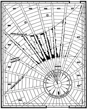The curved lines on the plaza mark the location of the Summer and Winter Solstice and show the path of the shortest and longest shadows of the year. The straight East/West line locates the path of the Spring and Fall Equinox. The times inscribed on the stone outer circle represent natural or "Sun" time. The walkways are located at the mean position of Eastern Standard Time. The inner circle is marked with words from Ecclesiastes which reflect upon the nature of time and the seasons.[4]