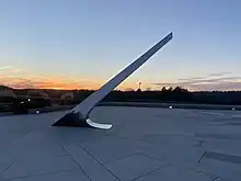 The gnomon, or pointer stands 14.62' above the surface of the plaza and is 24.27' long, measured along its spine. The angle of the gnomon is equal to the latitude, or 38o 10'25" from horizontal and points to the true North Pole and Polaris, the North Star. The gnomon was cut from 3/16" thick stainless steel and fabricated in Springfield, Oregon by metal sculptor and welding engineer Arthur Ross Cady.[5]