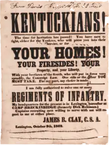 Almost immediately following the results of the 1861 election, William "Bull" Nelson established Camp Dick Robinson, a Union recruiting camp, in Garrard County.[25] When Crittenden objected to this violation of Kentucky's neutrality, Nelson replied, "That a camp of loyal Union men, native Kentuckians, should assemble in camp under the flag of the Union and upon their native soil should be a cause of apprehension is something I do not clearly understand."[28] Governor Magoffin appealed to President Lincoln to close the camp, but he refused.[29] Meanwhile, Confederate volunteers covertly crossed the Tennessee border and massed at Camp Boone, just south of Guthrie.[29] Kentucky's fragile neutrality was nearing an end.