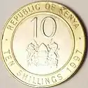 | 10/= | 5 mm | 23 grams | Bi-metallic coin (Nickel-plated steel center plug with a Brass-plated steel outer ring) | Reeded | Coat of arms of Kenya; text "Republic of Kenya" in English and Swahili | Lion; denomination in English and Swahili | |