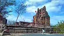 Tho old Shiva temple, built perhaps at the end of the tenth century, is of hard lasting stone partly red partly yellow. Except the shrine and spire, the temple collapsed during the 1819 Rann of Kutch earthquake. The shrine measures 8 feet 6 inches square inside, with walls 2 feet 7 inches thick, surrounded by a path 2 feet 6 inches wide, lighted by two open cut-stone windows. Of the hall, which was 18 feet 9 inches wide, only a part of the north wall with one window is left. The wall sculptures, though not numerous, are well executed, and on the faces of the spire is an elaborately cut ornament representing the outlines of a chaitya window, repeated over a triangular face, with human figurines in-between. Of these triangles of sculpture there are eight on each side, gradually lessening as they rise higher one over the other. The corners of the shrine are mounted by miniature spires, and above them are other four similar, but set further inwards; above these and the sculpture, rises the massive outline of the great central spire all beautifully carved.[1]